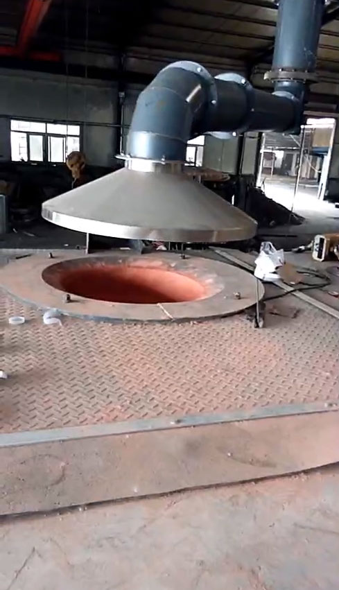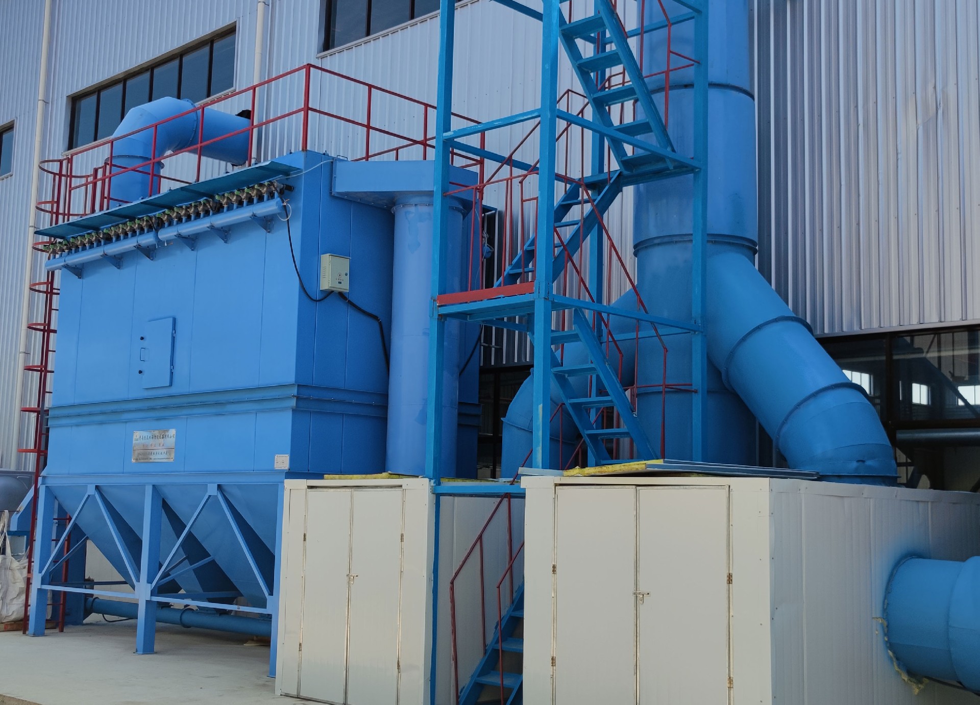 電爐除塵器裝置系統為:將來自工業硅生產電爐的煙氣,在離心式主風機的抽吸作用下,煙氣由半封閉式電爐內引出,沿著煙道首先進入旋風除塵器。把粗粒、火星分離出來,使其沉降于灰斗至卸料器排出。在有旋風除塵器的出口排出,超細粉塵及含塵氣體進入一個熱交換器,風冷降低煙氣溫度,然后其它塵粒隨氣流上升進入布袋除塵器各個袋室。經濾袋過濾后,粉塵被阻留在濾袋外面,凈化后的氣體由濾袋進入箱體,再通過袋口和上箱體(凈氣室)出風口進入離心式主風機在排入煙囪至大氣。灰斗中的粉塵定時或連續由卸灰系統排出。